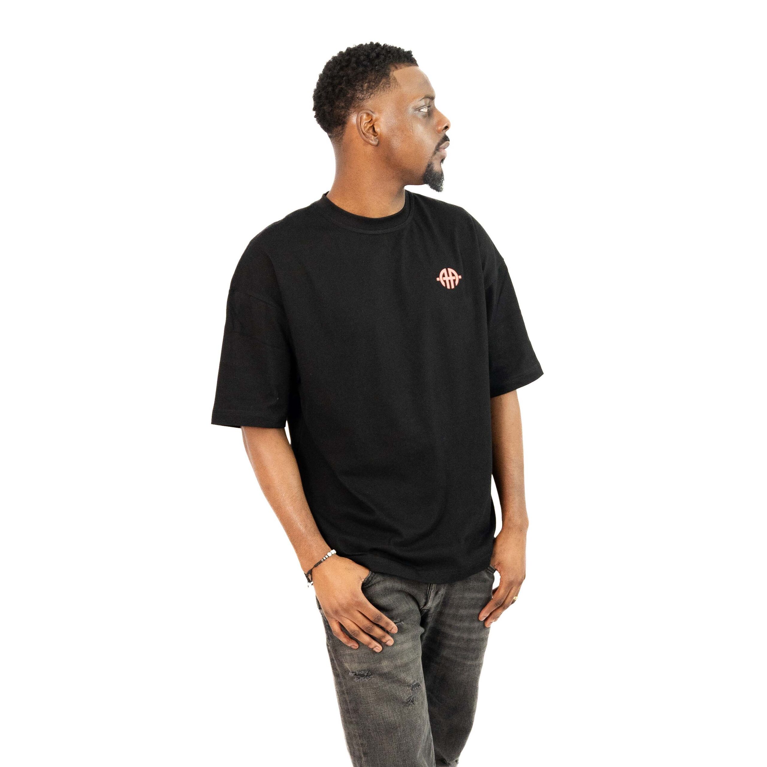 - The model is 1.84m and wears size M. Our T-shirt is oversized, so size down for regular fit.